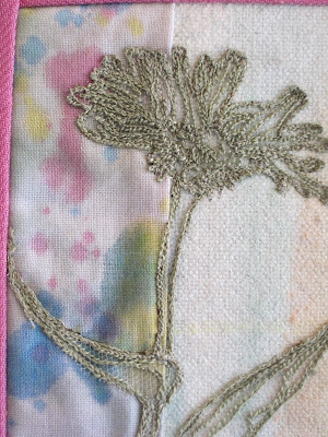 "A Predictable Attraction" B. J. Adams 2009 12" X 12" Purchased from SAQA online auction for 2009.B.J. is another artist whose work I have admired for years - at least twenty, I think. I am especially taken with her alphabet series (see her website). This is a beautiful little quilt, both visually and technically, I am so happy to have it in the Collection.