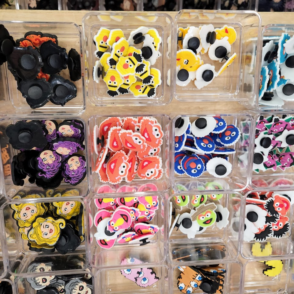 What, I wondered, are shoe charms? There were several tables covered with plastic bins full of little cartoon characters and different motifs. They fit in the holes of Crocs shoes,
