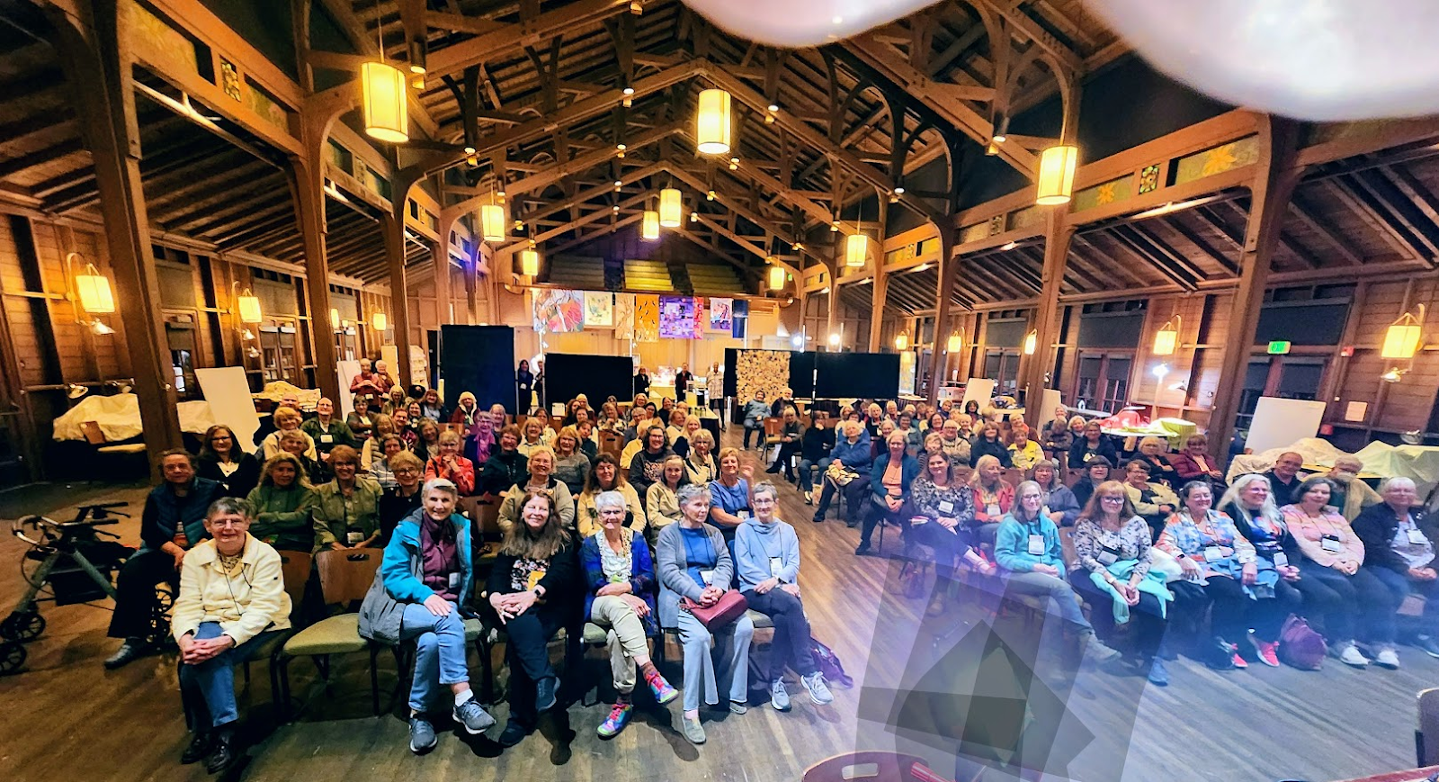 Before I started my program on Sunday evening I took this picture of the audience in Merrill Hall, one of the original buildings from 1918 and a remarkable architectural achievement. The Cotton Patch shop is in the back at far left and my table is in the far back on the right The blurry spot at the bottom of the picture is where I marked out the glare of the spotlight.